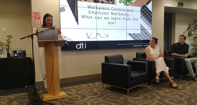 Jaime Lomas from DTI Lawyers was our first speaker and spoke about fundamentals of workplace culture and wellbeing and what you can learn from the law. The Health and safety work act 2015 and the legal obligation of employers.